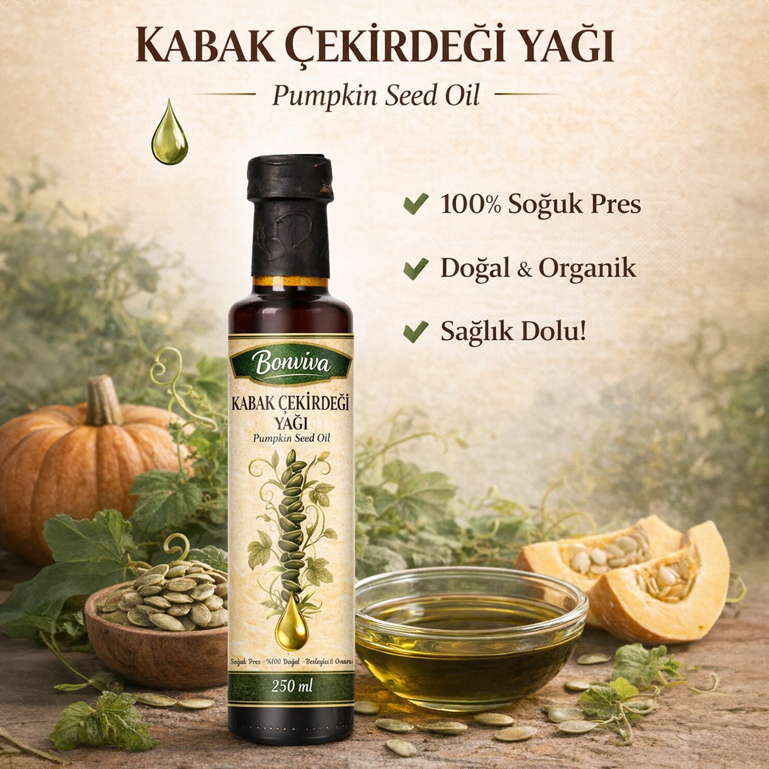 BONVİVA Soğuk Sıkım Saf Kabak Çekirdeği Yağı 250 ml